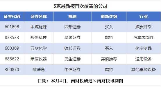 首次覆盖方面,4日券商共进行了5次首次覆盖。其中,中煤能源获得西部证券“买入”评级,骏创科技获得华源证券“增持”评级,万华化学获得德邦证券“买入”评级,禾信仪器获得民生证券“谨慎推荐”评级,欧陆通则获得中信证券“增持”评级。