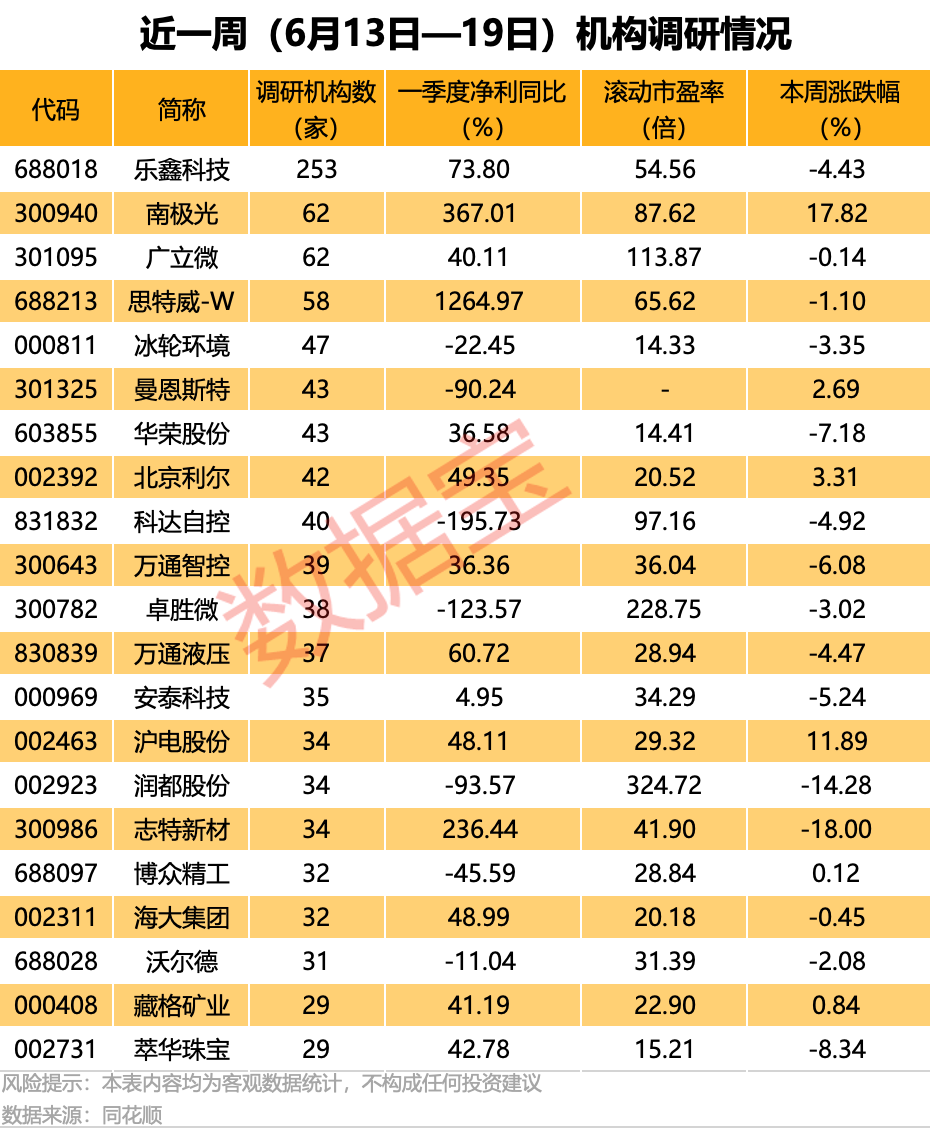 近一周机构调研个股数量有240多只,乐鑫科技调研机构数最多,达253家,含68家基金公司等。