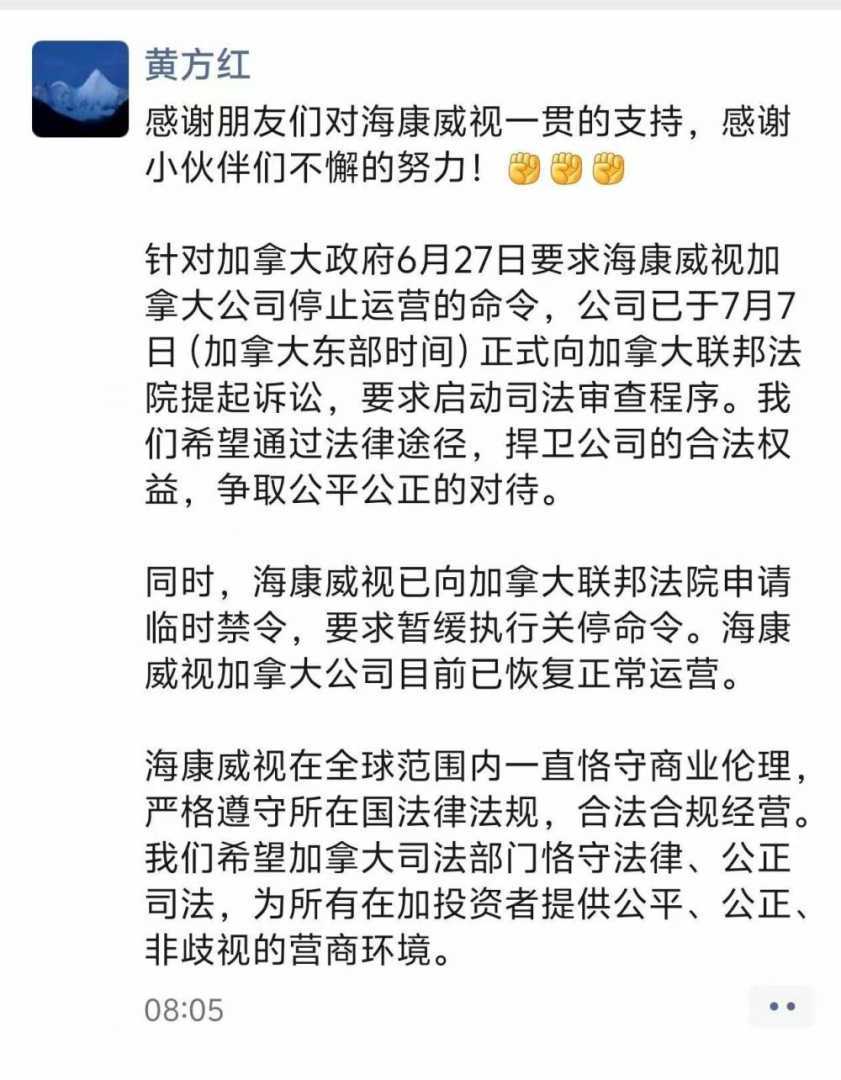 7月8日上午,海康威视(002415.SZ)首席合规官黄方红在微信朋友圈发文表示,“针对加拿大政府6月27日要求海康威视加拿大公司停止运营的命令,公司已于7月7日(加拿大东部时间)正式向加拿大联邦法院提起诉讼,要求启动司法审查程序。我们希望通过法律途径,捍卫公司的合法权益,争取公平公正的对待”。