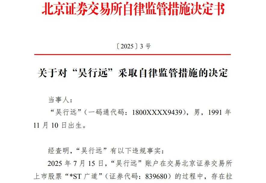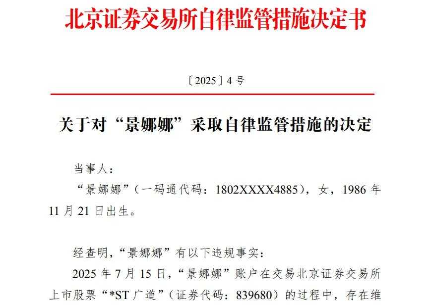 北交所指出,7月15日,“景娜娜”账户在交易*ST广道的过程中,存在维持涨跌幅限制价格的异常交易行为。*ST广道为退市风险警示股票,近期多次因价格异常上涨停牌核查,“景娜娜”账户的异常交易行为,持续强化股票涨幅限制价格状态,可能误导其他投资者,情节十分严重,市场影响恶劣。