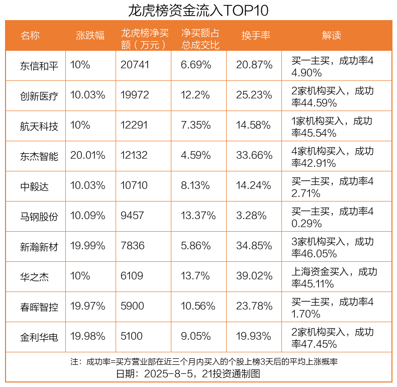 8月5日龙虎榜:东信和平获资金抢筹,山河智能资金出逃