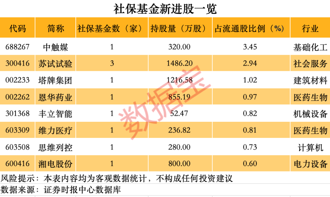 从持股比例来看,新进股中社保基金持有比例最多的是中触媒,持股量占流通股比例为3.45%,其次是苏试试验,社保基金持股比例为2.94%,持股比例居前的还有塔牌集团、恩华药业、丰立智能等。