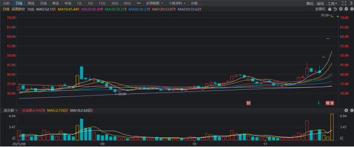 受并购重组概念提振,计算机板块热股品高股份近日成为活跃资金重点关注方向,其自11月21日以来连续涨停至今。目前,其股价已升至70.58元,并创历史新高,同时年内涨幅也扩大至173.04%,不计算年内新股,相当于跑赢97.89%市场个股。从量能数据上看,品高股份今日放量明显,全天成交额6.94亿元,为昨日的7.9倍,同时创上市以来新纪录。