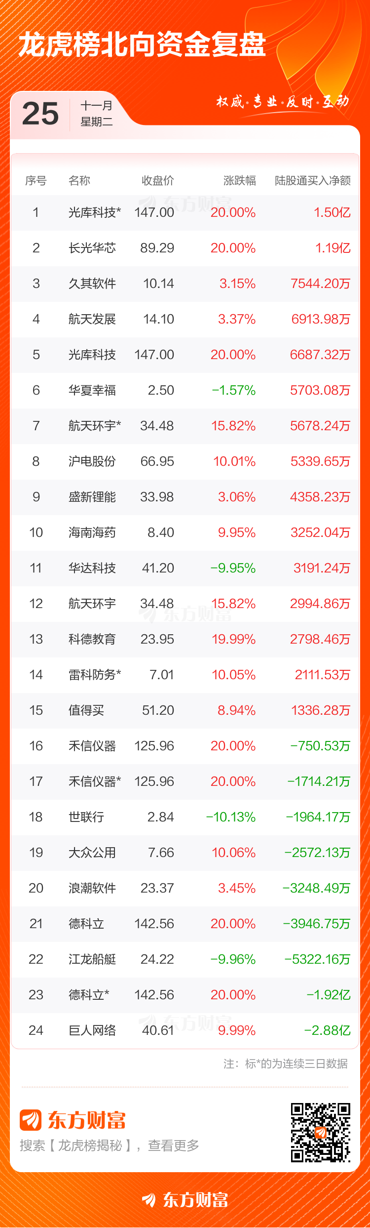 11月25日龙虎榜数据显示,光库科技净买入额最高,达5.42亿元。沪电股份当天也表现不俗,游资席位净买入金额达9719.80万元。本内容基于AI生产,不构成投资建议。