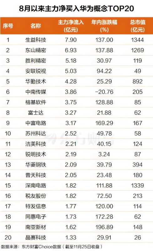东方财富Choice数据显示,自今年8月以来,主力资金抢筹多只华为概念股,净买额排名前20的个股总计被抢筹64亿元。