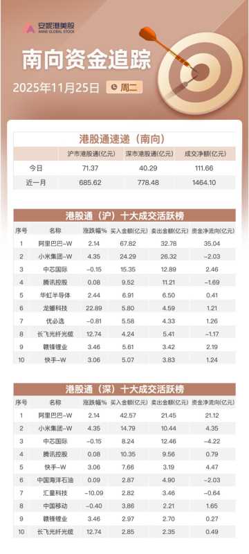 今日恒指高开低走宽幅震荡,全天南向资金净买入约111.66亿港元。其中,沪港股通净流入约71.37亿港元,深港股通净流入约40.29亿港元。