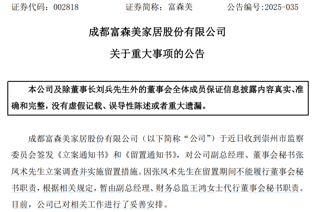 富森美(002818)近日收到崇州市监察委员会通知,对公司副总经理、董事会秘书张凤术进行立案调查并实施留置措施。公告显示,张凤术暂由公司其他高管代行职责,公司已妥善安排相关工作,该事项对公司生产经营无重大影响。