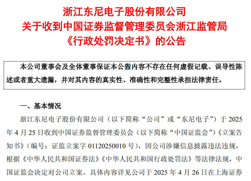 11月12日晚间,ST东尼称,11月12日,公司收到中国证券监督管理委员会浙江监管局下发的《行政处罚决定书》。此前于今年4月25日,东尼电子收到中国证监会《立案告知书》,因公司涉嫌信息披露违法违规,中国证监会决定对公司立案。