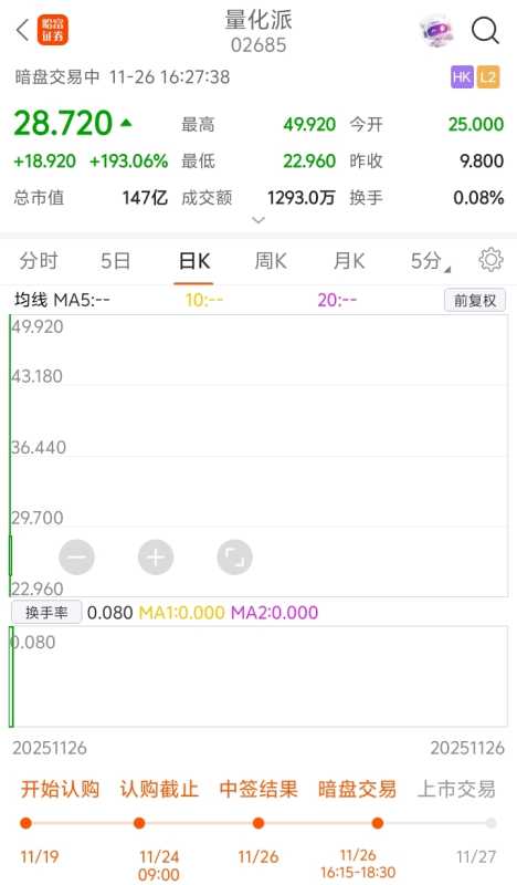11月26日,量化派暗盘飙涨逾190%,总市值近150亿港元;不计手续费,中签一手赚逾9000港元;公司每股定价9.8港元,每手500股,将于11月27日(周四)正式挂牌交易。