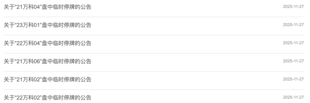债券方面,由于大幅下跌,据深交所公告,目前“22万科02”、“21万科02”、“21万科06”、“22万科04”、“23万科01”、“21万科04”均触发盘中临时停牌。