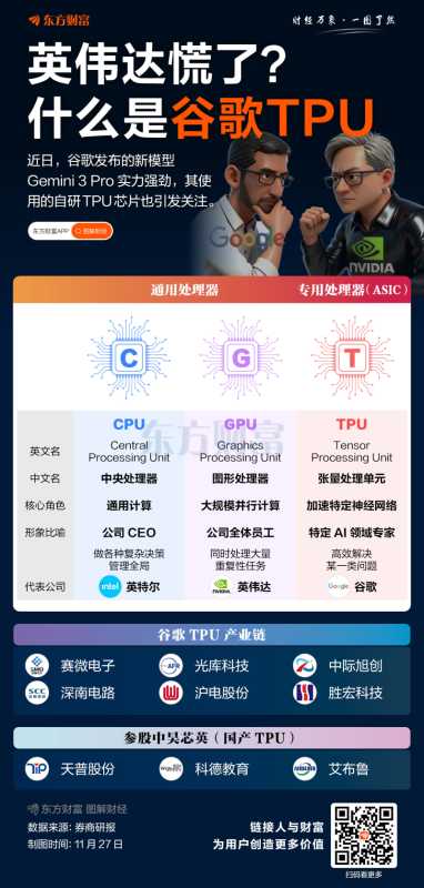 而谷歌股价的上涨,一方面源于其新模型Gemini 3 Pro和Nano Banana Pro的亮眼表现;另一方面是其自研的TPU芯片(也即Gemini 3 Pro所使用的芯片)或将争夺英伟达的市场。