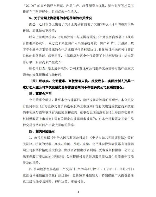东芯股份(688110.SH)发布异动公告,据悉,近日市场上出现了关于公司对外投资企业砺算科技(上海)有限公司签署了大额GPU芯片订单的相关市场传闻。经向上海砺算核实,上海砺算近日与某国内领先云计算服务商签署了《战略合作框架协议》,双方就未来在国产云桌面系统开发、国产AIPC、云渲染、数字孪生解决方案等领域的合作达成指导性的框架协议,具体项目未来再另行签订具体的业务协议。截至目前,上海砺算与该企业仅签署了上述框架协议,尚未签署订单,目前尚未产生收入。公司对上海砺算的投资采用权益法核算,未纳入合并报表范围。