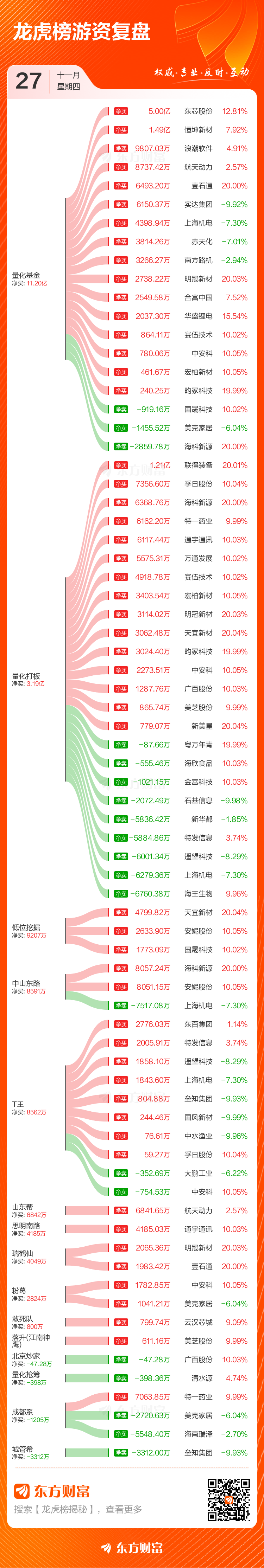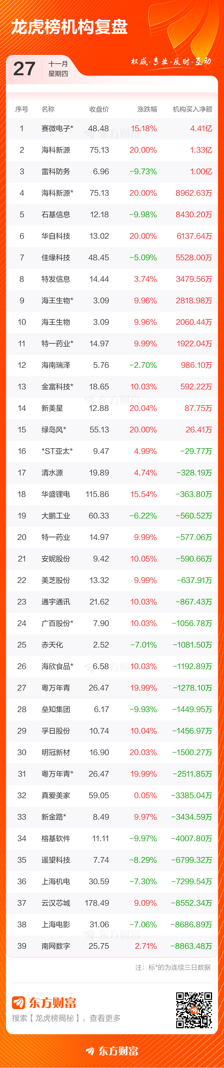 11月27日龙虎榜显示,赛微电子净买入额居首,游资席位中,海科新源“中山东路”净买入金额最高。本文基于AI生产,不构成投资建议。