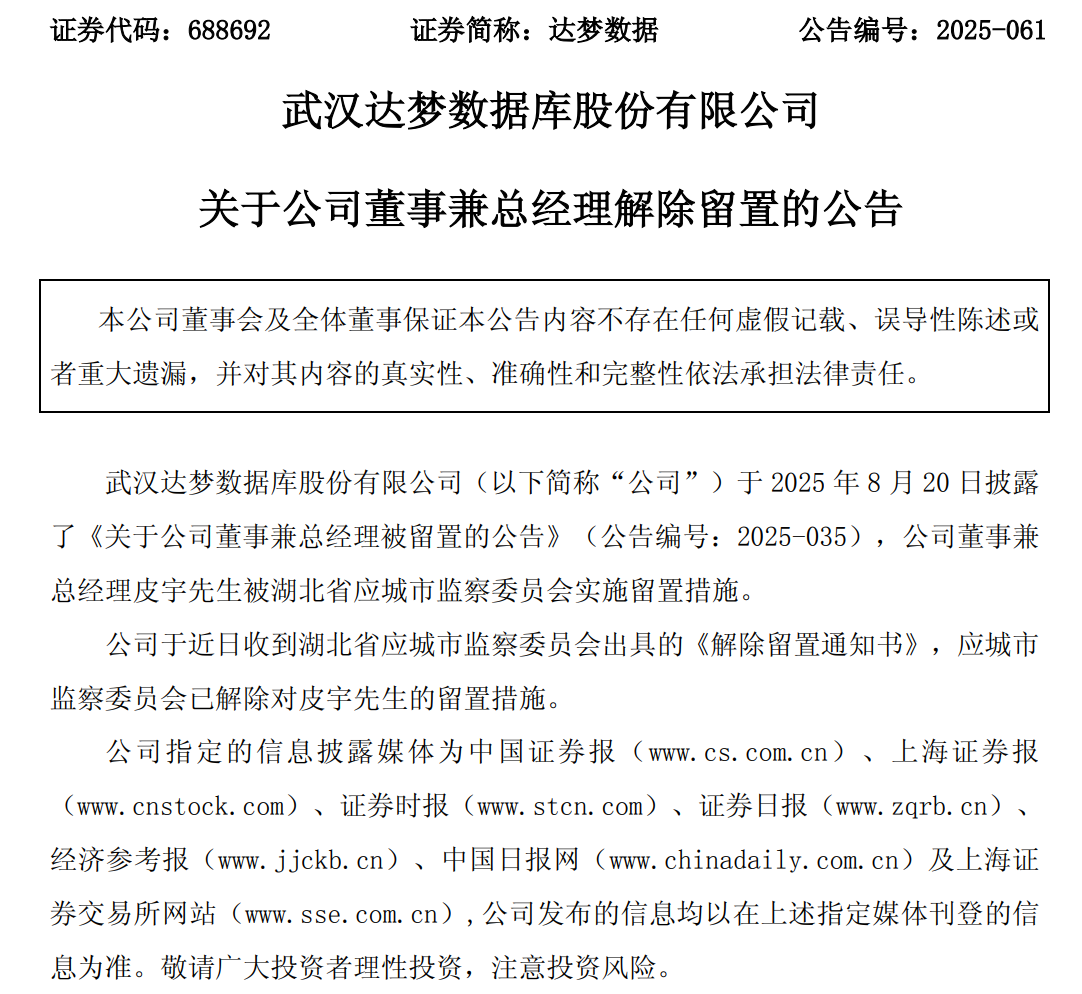 此前,达梦数据于8月19日晚间公告称,公司董事兼总经理皮宇被湖北省应城市监察委员会立案调查并实施留置措施。