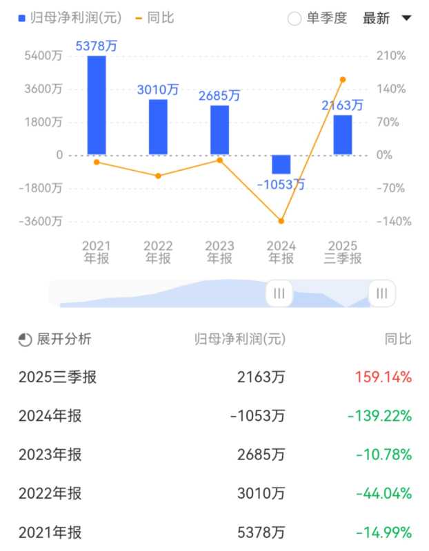 2025年前三季度,公司营业收入为2.38亿元,同比下降14.32%;归母净利润为2163万元,同比上升159.14%;扣非归母净利润为1118万元,同比上升2067.24%