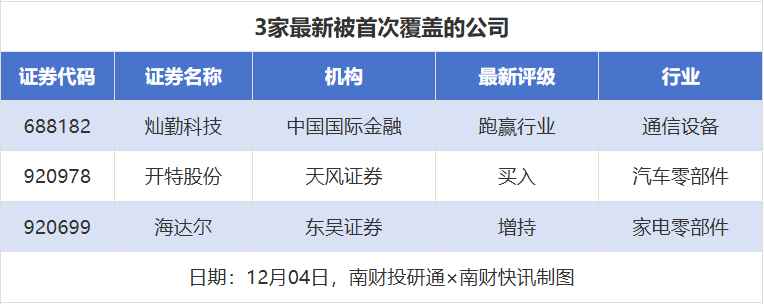首次覆盖方面,12月4日券商共给出了3次首次覆盖,其中灿勤科技获得中国国际金融给予“跑赢行业”评级,开特股份获得天风证券给予“买入”评级,海达尔获得东吴证券给予“增持”评级。