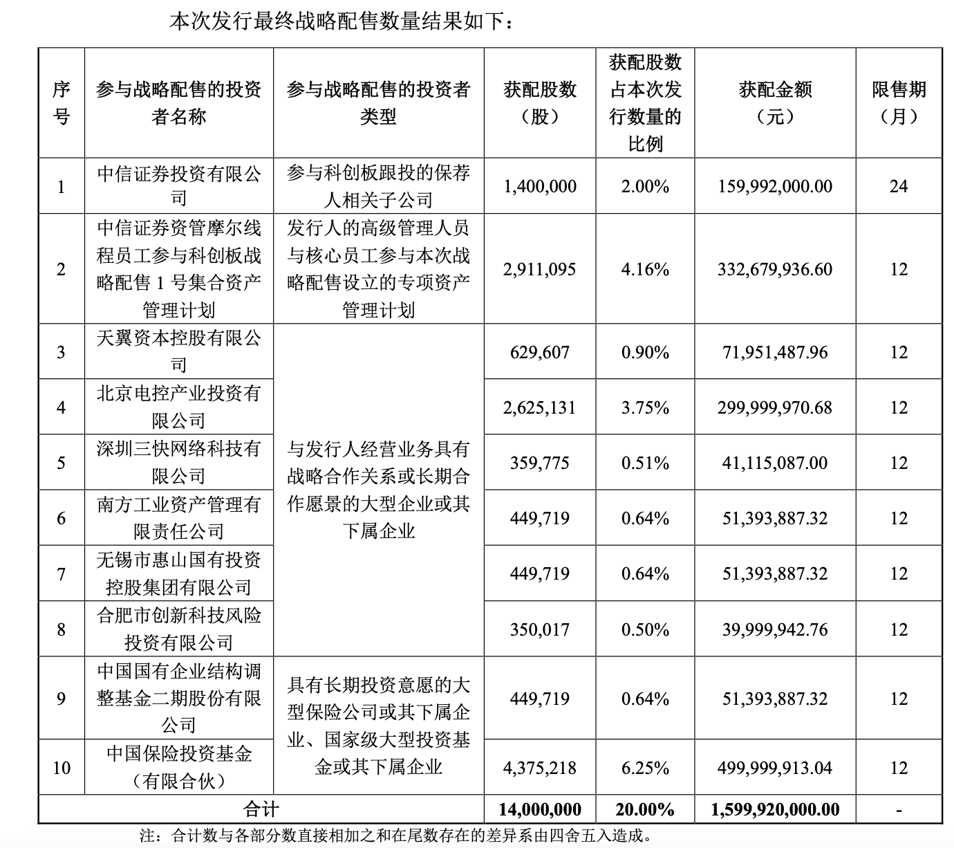 摩尔线程本次发行的7000万股新股,采取“战略配售+网下发行+网上发行”相结合的方式进行发行。各大机构对摩尔线程的认购热情非常之高。公司披露的发行结果显示,此次发行战略配售数量为1400万股,占本次发行总量的20%,参与方涉及中信证券、中信证券员工资管计划及多家产业资本、国资平台等,如中国保险投资基金(有限合伙)获配5亿元。另外,美团旗下的深圳三快网络科技有限公司、中国电信旗下的天翼资本控股等均获配。