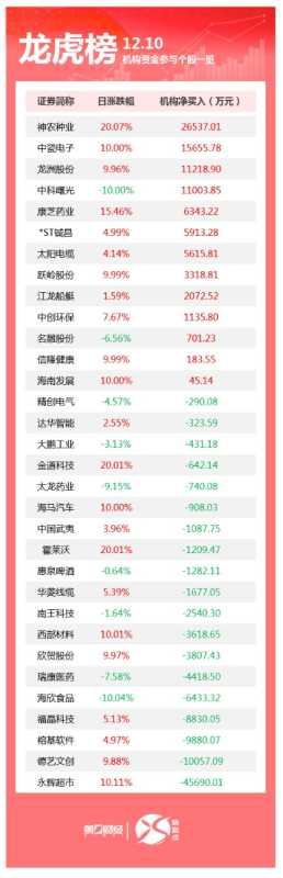 12月10日龙虎榜数据显示,32只个股现机构身影,其中13只股票获机构净买入,19只股票遭机构净卖出。前三名分别为神农种业、中瓷电子、龙洲股份。