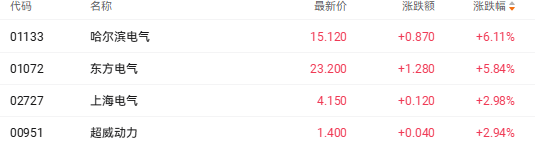今日港股电气设备股表现活跃。截至发稿,哈尔滨电气(01133.HK)涨6.11%、东方电气(01072.HK)涨5.84%、上海电气(02727.HK)涨2.98%。