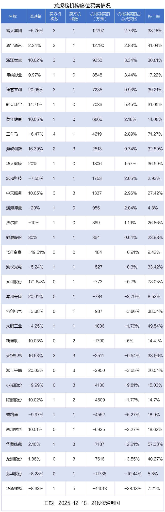其中,机构净买入金额最多的是雪人集团(002639.SZ),当日收盘下跌5.76%,换手率为38.18%。