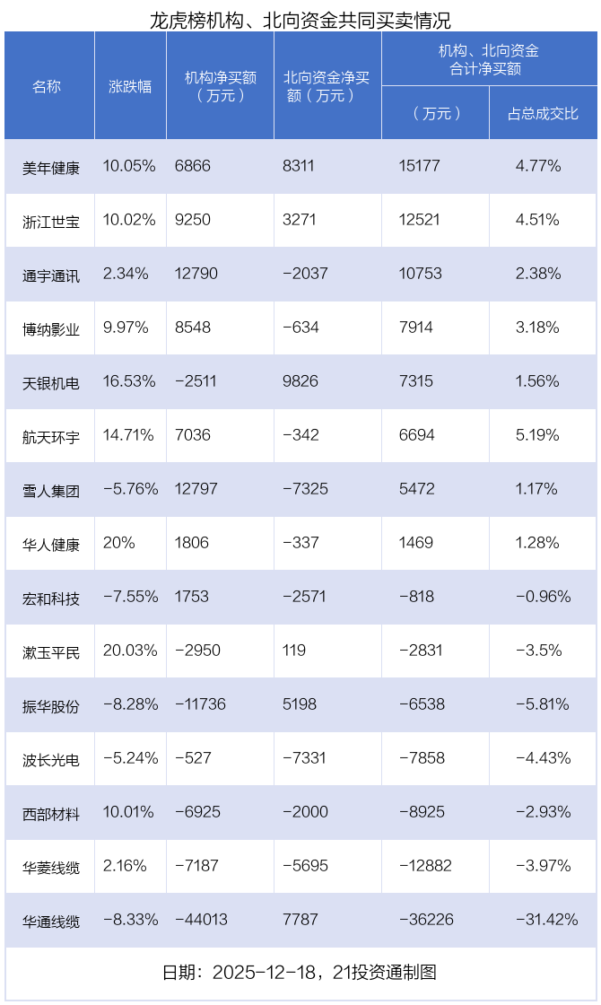 值得注意的是,机构和北向资金共同净买入了美年健康、浙江世宝等2股;共同净卖出了西部材料、华菱线缆、波长光电等3股;在天银机电,华通线缆,振华股份,漱玉平民,华人健康,航天环宇,博纳影业,通宇通讯,宏和科技,雪人集团上出现分歧,机构净卖出天银机电2511.14万元,北向资金净买入9826.18万元;机构净卖出华通线缆4.4亿元,北向资金净买入7786.96万元;机构净卖出振华股份1.17亿元,北向资金净买入5197.95万元;机构净卖出漱玉平民2949.92万元,北向资金净买入119.19万元;机构净买入华人健康1805.81万元,北向资金净卖出337.22万元;机构净买入航天环宇7036.32万元,北向资金净卖出341.91万元;机构净买入博纳影业8547.84万元,北向资金净卖出633.64万元;机构净买入通宇通讯1.28亿元,北向资金净卖出2036.82万元;机构净买入宏和科技1753.34万元,北向资金净卖出2571.44万元;机构净买入雪人集团1.28亿元,北向资金净卖出7324.71万元。