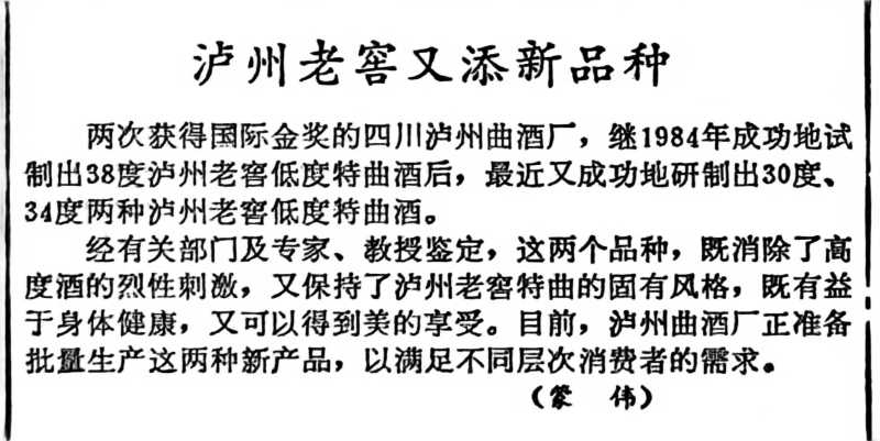 1987年12月8日,《经济参考报》刊发的《泸州老窖又添新品种》写道:“两次获得国际金奖的四川泸州曲酒厂,继1984年成功地试制出38度泸州老窖低度特曲酒后,最近又成功地研制出30度、34度两种泸州老窖低度特曲酒。”