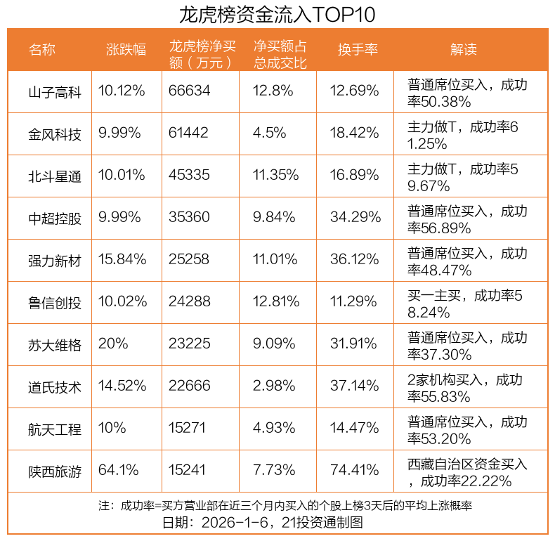 1月6日,上证指数上涨1.5%,深证成指上涨1.4%,创业板指上涨0.75%。盘后龙虎榜数据显示,共有59只个股因当日异动登上龙虎榜,资金净流入最多的是山子高科(000981.SZ),达6.66亿元。