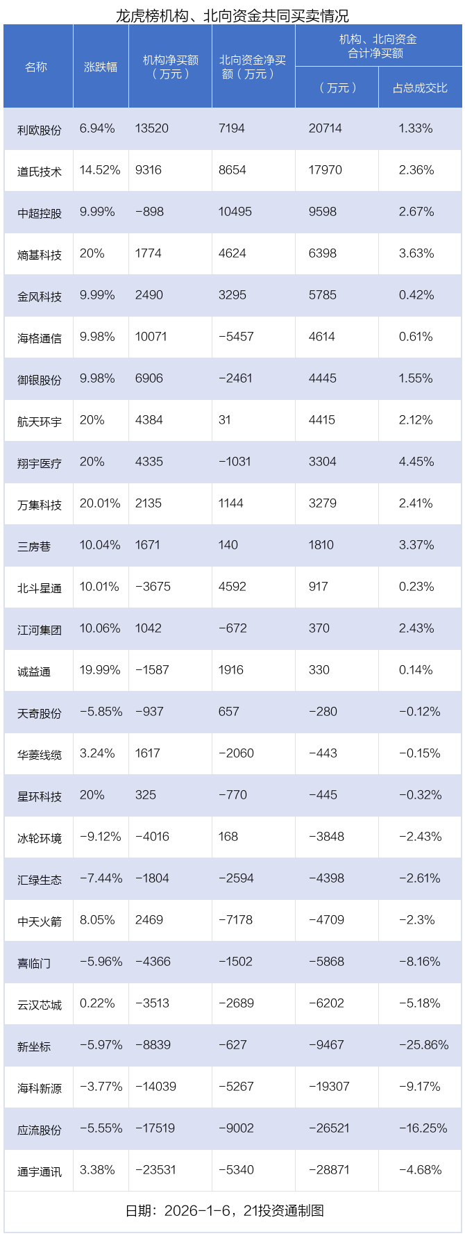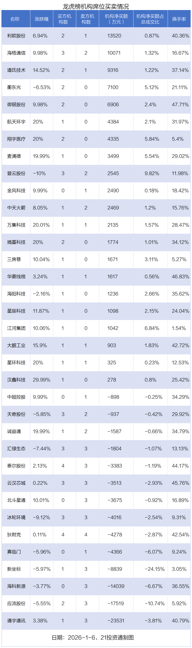 1月6日,35只个股龙虎榜出现了机构的身影,机构合计净卖出1.37亿元。具体来看,机构净买入21股,净卖出14股。