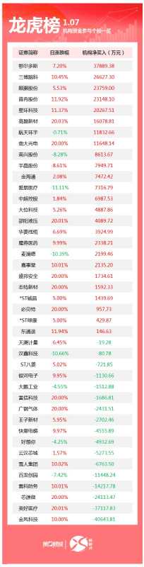 1月7日龙虎榜:机构买入前三名及卖出前三名