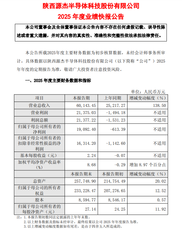 而就在2月底,源杰科技发布业绩快报,2025年预计实现营业收入6.01亿元,同比增长138.50%;预计实现利润总额人民币2.14亿元;预计实现归母净利润1.91亿元,较2024年亏损613万元的规模,相当于增长了超32倍。