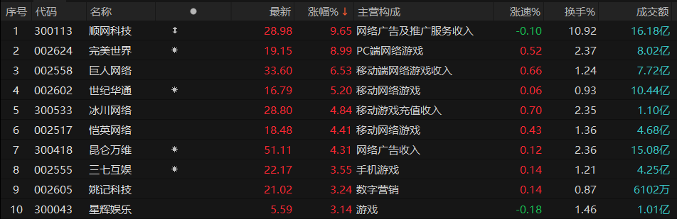 4月1日,前期走弱的游戏板块(申万二级)大幅反弹,领涨市场,现涨超4%,个股普涨。其中顺网科技涨近10%,完美世界、巨人网络、世纪华通、恺英网络、冰川网络等跟涨。