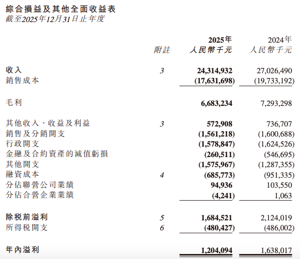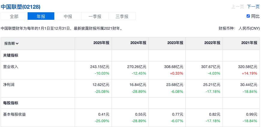 近日,中国联塑(02128.HK)发布2025年度全年业绩公告。2025年中国联塑收入243.15亿元,同比减少10%;毛利减少8.4%至66.83亿元;年内溢利减少26.5%至12.04亿元。每股基本盈利为0.41元,减幅为25.5%。这是中国联塑自2021年来净利润增速连续第5年下滑。