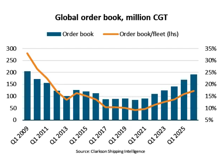 BIMCO表示,到2026年第一季度末,全球手持订单达到1.91亿CGT,约占现有船队的17%。这一比例不仅显著高于近几年水平,也意味着全球航运业正在经历一轮较长周期的新造船扩张。