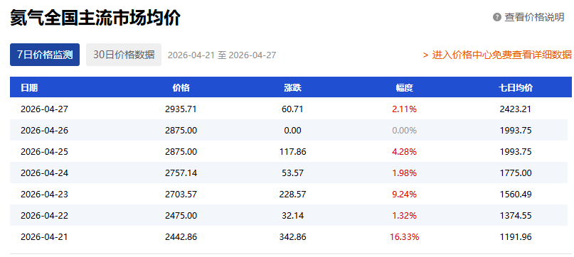 消息面上,受中东局势及俄罗斯限制出口影响,氦气近期持续涨价。据卓创资讯,4月27日,氪气全国市场主流均价报2935.71元/瓶,七日均价涨至2423.21元/瓶,较4月21日的七日均价(1191.96元/瓶)已经翻倍。