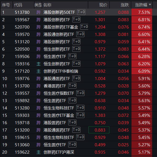 今日早盘,医药板块表现抢眼,多只医药股涨停。其中,欧康医药“30cm”涨停,多瑞医药、和元生物、诚达药业“20cm”涨停,艾迪药业、成都先导等个股均大涨超10%,超30股涨超9%。此外,多只港A相关医药ETF集体大涨,尤其是港股创新药ETF表现尤为突出,截至发稿,港股创新药50ETF涨幅超过7.5%。