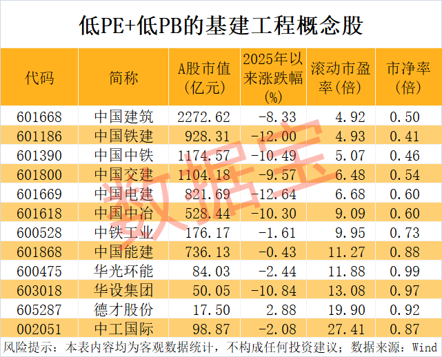 据数据宝统计,滚动市盈率低于30倍且市净率低于1倍的基建工程概念股共12只。其中,2025年以来跌幅超10%的有5只。上述12只低估值股票中,7股上涨空间逾30%,中国电建上涨空间达53.53%,位居首位。