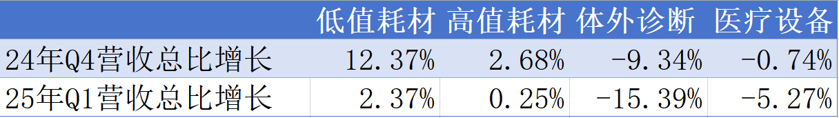 高值耗材整体表现稳健,常用高值耗材大多已纳入集采,降价压力释放,国产中标份额提升。低值耗材板块在低基数效应消除后,回归常态增长。