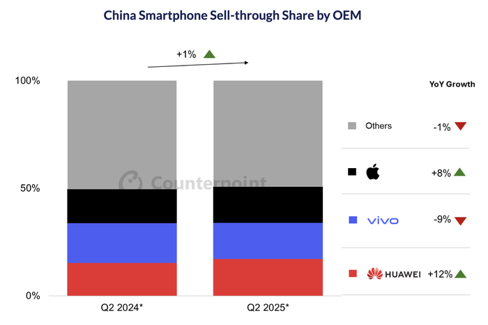 其中,华为预计将同比增长12%,成为该季度中国市场的销量冠军。而苹果凭借iPhone 16 Pro和Pro Max机型,预计将实现同比增长8%——这将是苹果自2023年第二季度以来首次实现正增长。