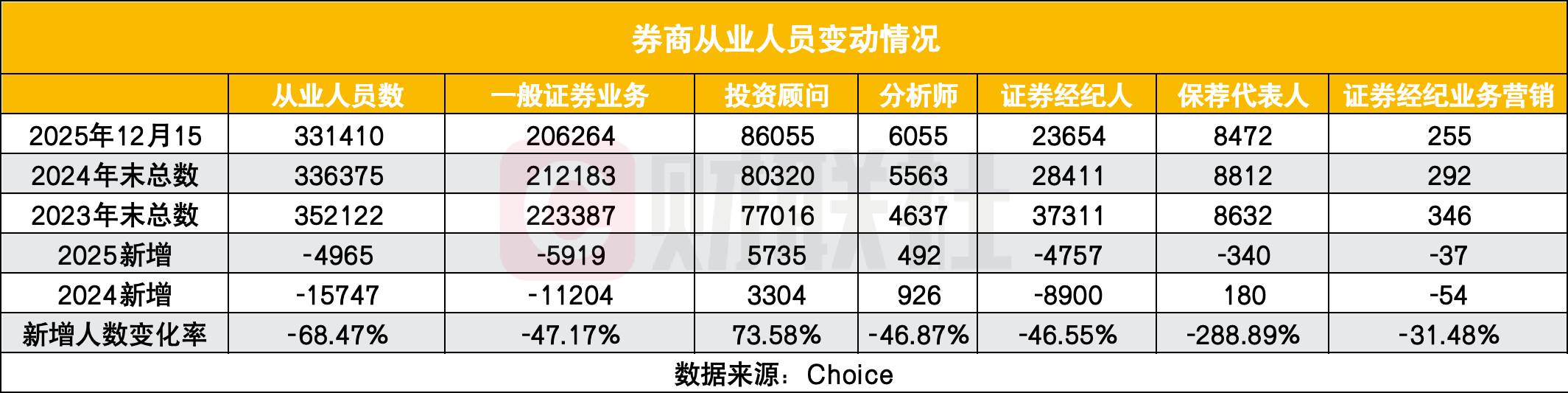 数据显示,券商从业人员总数的下滑态势已持续2年。2023年末全行业从业人员为35.21万人,2024年末降至33.64万人,截至2025年12月15日进一步回落至33.14万人,2年累计减少2.07万人,降幅达5.88%。