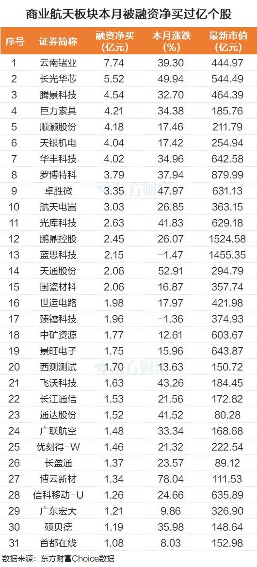 作为当前市场的热门题材之一,商业航天板块多股4月以来被杠杆资金积极抢筹。比如云南锗业被融资净买入7.74亿元。长光华芯被融资净买入5.52亿元。整体而言,东方财富Choice数据显示,有31股本月被融资净买入过亿。