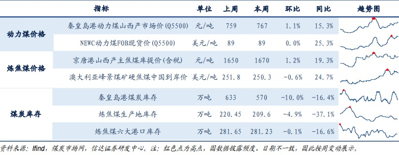 消息面上,近期动力煤、炼焦煤价格呈现震荡抬升之势。信达证券表示,动力煤价格方面,