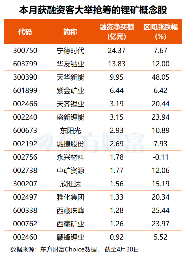 资金方面,东方财富Choice数据显示,本月共有14只锂矿概念股获融资客超1亿元抢筹,宁德时代、华友钴业分别被“扫货”24.37亿和13.83亿元,领涨股天华新能获杠杆资金加仓9.95亿元,紫金矿业、天齐锂业、盛新锂能、东阳光、融捷股份融资净买额均在2.6亿至6.5亿元之间。
