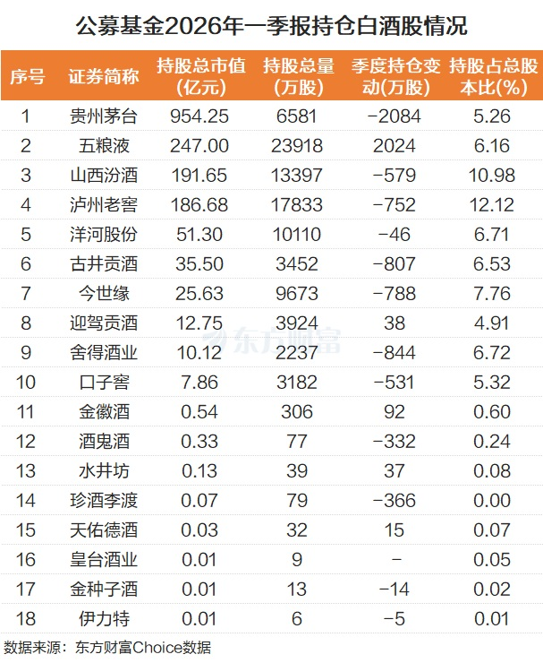 从刚刚披露的公募基金2026年一季报来看,公募基金也在适应白酒的这种“缩量周期”,整体在积极减配白酒股。比如贵州茅台,作为曾经连续多年的第一大重仓股,目前只是公募基金的第5大重仓股,五粮液则是跌出了前20。