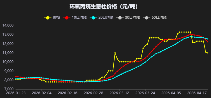 近两个月,环氧丙烷价格整体走强。据生意社数据,截至4月23日。环氧丙烷价格报11000元/吨,虽然受下游需求端新单不足、采购谨慎等多重因素共同作用,近一周环氧丙烷较月中约13000元/吨的价格有所下滑,但与2月下旬7800元/吨的低点相比,累计涨幅仍超40%。