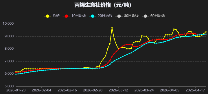 生意社数据显示,截至4月22日,丙烯价格已从2月末的6411元/吨猛涨至9361元/吨,累计涨幅超过46%。分析人士认为,若丙烯价格继续走高,环氧丙烷受制于成本端压力,或将重回前期持续上涨态势。
