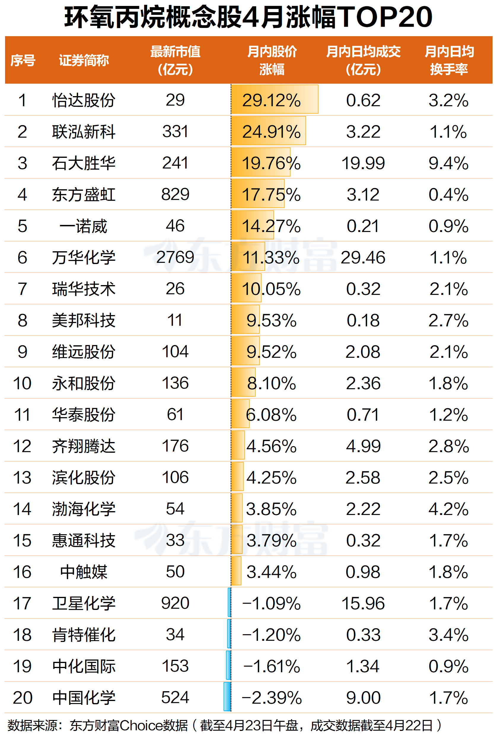 4月以来,环氧丙烷概念股反复活跃,超七成个股实现股价上涨,怡达股份涨近30%,联泓新科涨近25%,石大胜华、东方盛虹、一诺威、万华化学、瑞华技术等5股月内涨幅均超10%。