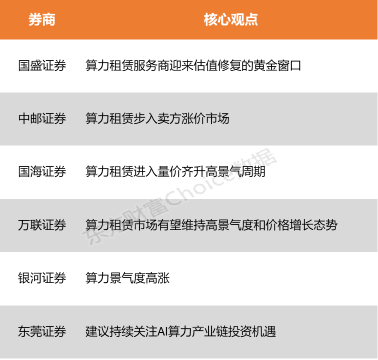 国盛证券表示,国内算力生态协同深化,国产替代与基础设施建设共振向上,算力租赁服务商迎来估值修复的黄金窗口。中邮证券指出,Token需求膨胀引致算力紧缺,算力环节全线涨价。其中,算力紧缺叠加上游存储等成本上升,促使算力租赁步入卖方涨价市场。