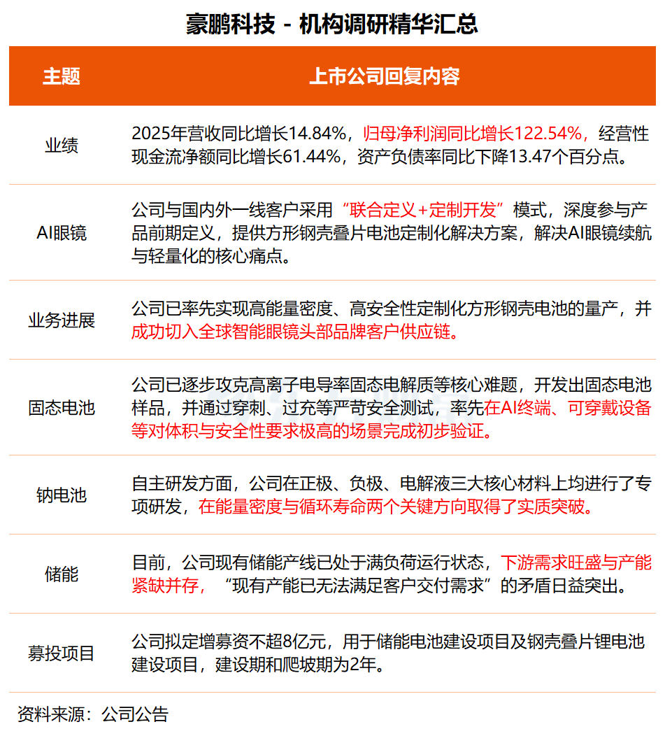 在调研中,豪鹏科技表示,公司储能业务从2024年起步到2025年快速放量,产能趋于紧张。2025年度,公司储能业务收入同比增长251.63%,处于快速放量初期。目前,公司现有储能产线已处于满负荷运行状态,下游需求旺盛与产能紧缺并存,“现有产能已无法满足客户交付需求”的矛盾日益突出。