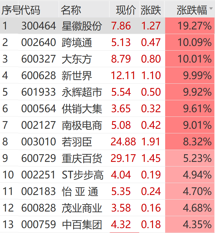 12月2日,A股消费板块在盘初即表现出强劲走势。零售股中,跨境通连续7日6板,永辉超市实现2连板,大东方11日9板,新世界则连续6板涨停。