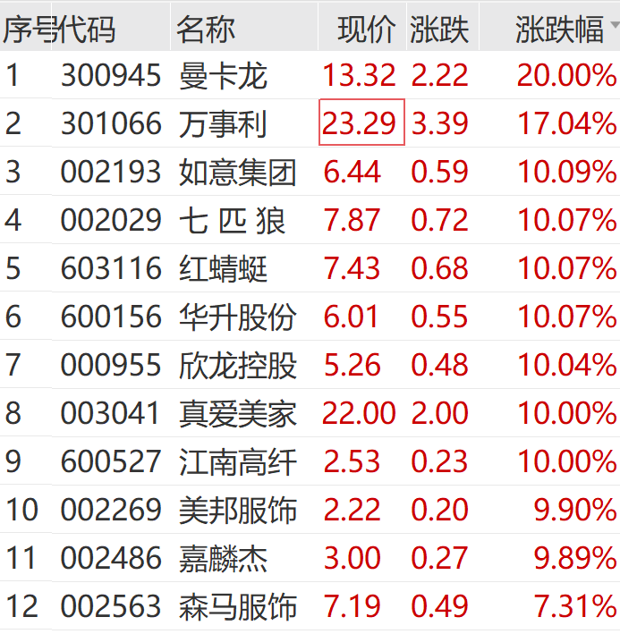 与此同时,纺织服饰板块亦同步拉升,曼卡龙20CM涨停,如意集团、七匹狼、美邦服饰、真爱美家等多只个股亦纷纷涨停。